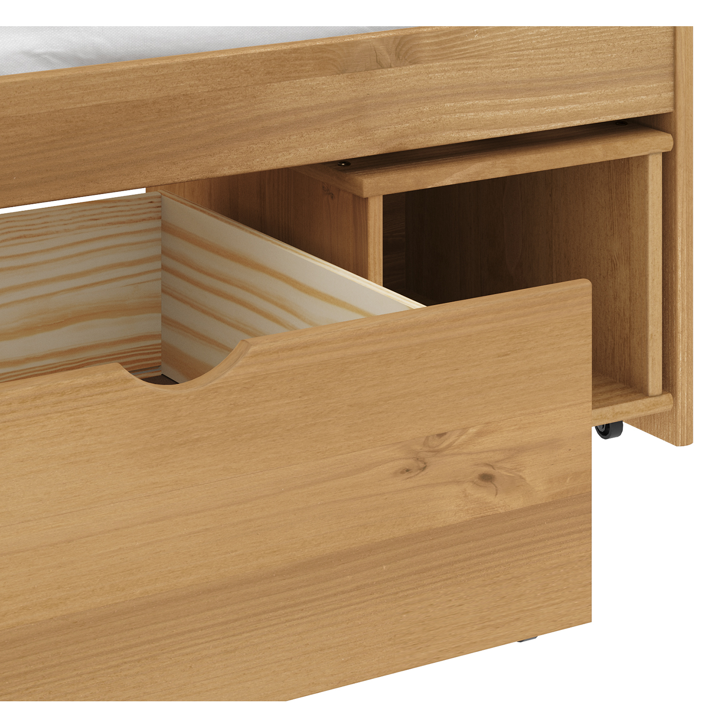 Kód produktu: 8801VMateriál je masivní borovice ve voskovaném provedení. Obsahuje 2 zásuvky s kovovými pojezdy, přičemž každá zásuvka má hloubku 27,5 cm.