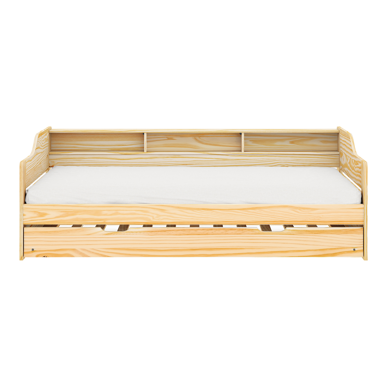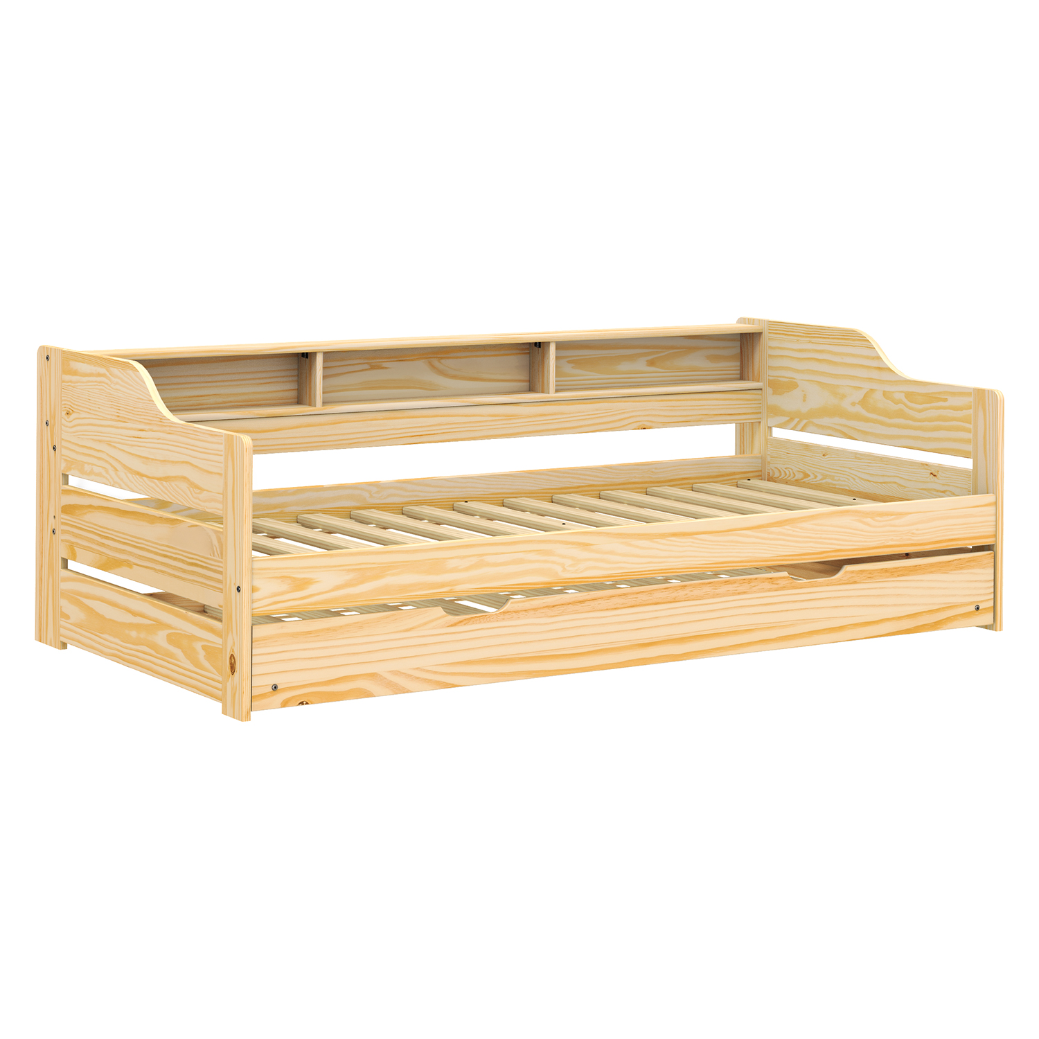 Postel je vyrobena z materiálu masiv borovice v lakovaném provedení. V zadní části se nachází otevřená police a v dolní části výsuvná přistýlka. Cena zahrnuje rošty (dřevěné laťkové), matrace nejsou v ceně. Doporučený rozměr matrací je 90 × 200 cm.