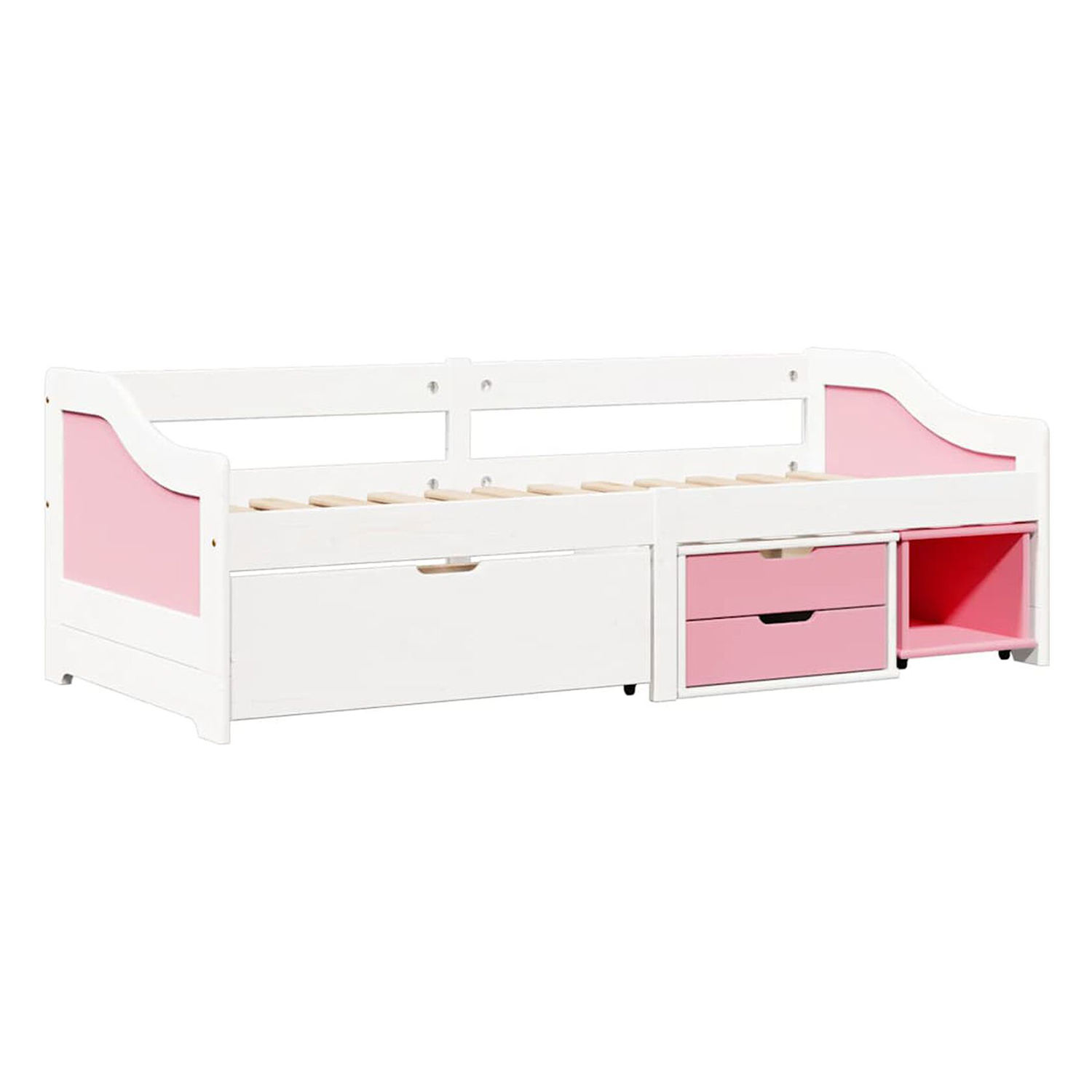 Materiál je masiv borovice v barevném provedení bílý / růžový lak, praktické úložné prostory pod postelí. Tyto zásuvky a otevřená police jsou v ceně, cena zahrnuje rošt (dřevěný laťkový), matrace není v ceně, doporučený rozměr matrace je 90 × 200 cm (š/h/v).