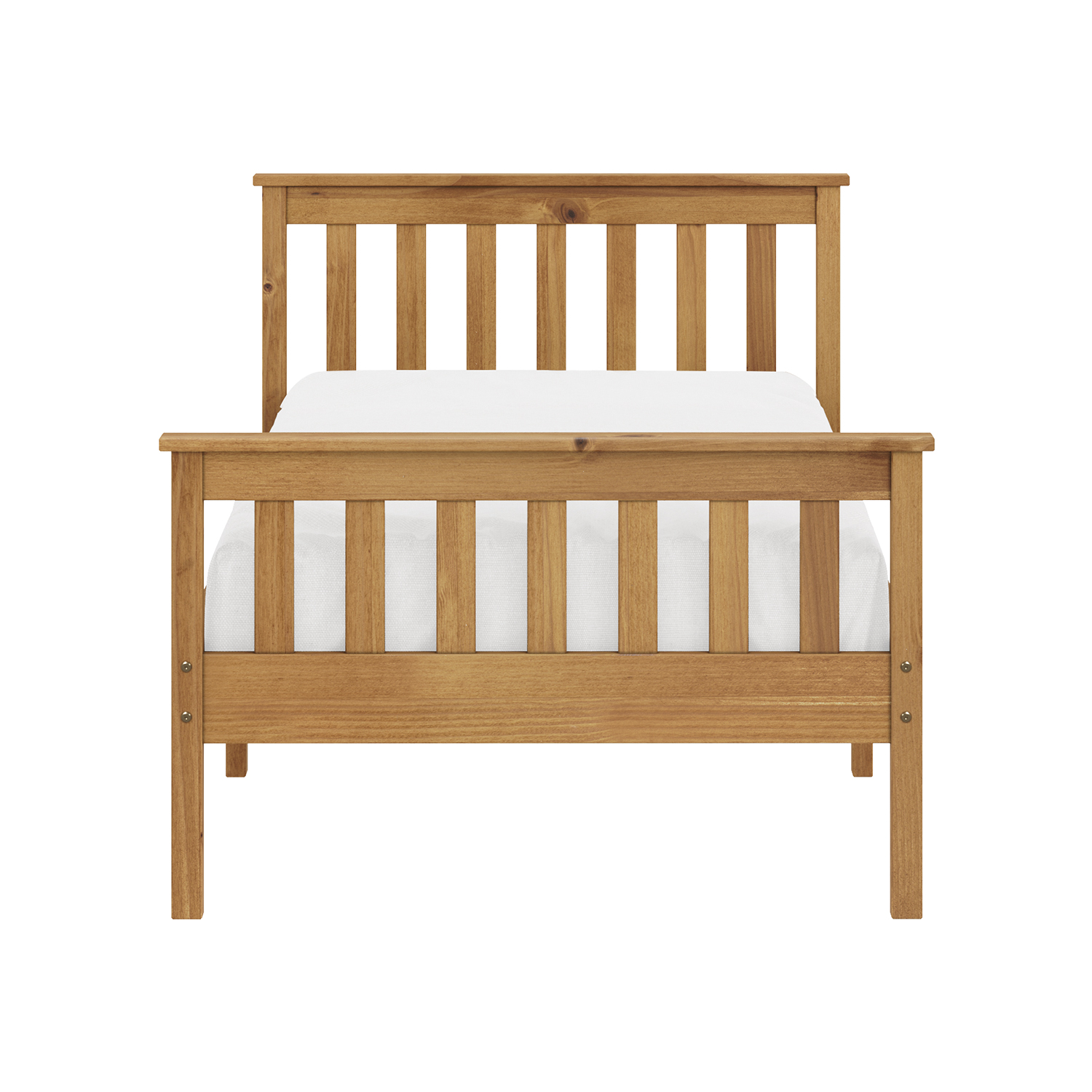 Kód produktu: 8072VMateriálem postele je masiv borovice s voskovaným medovým odstínem. Má čelo vysoké 80 cm a sed o výšce 38 cm, přičemž cena nezahrnuje rošt a matraci. Doporučuje se minimální výška matrace 15 cm a doporučený rozměr matrace je 90 × 200 cm spolu s roštem R1. Postel má doporučenou nosnost až do 120 kg.