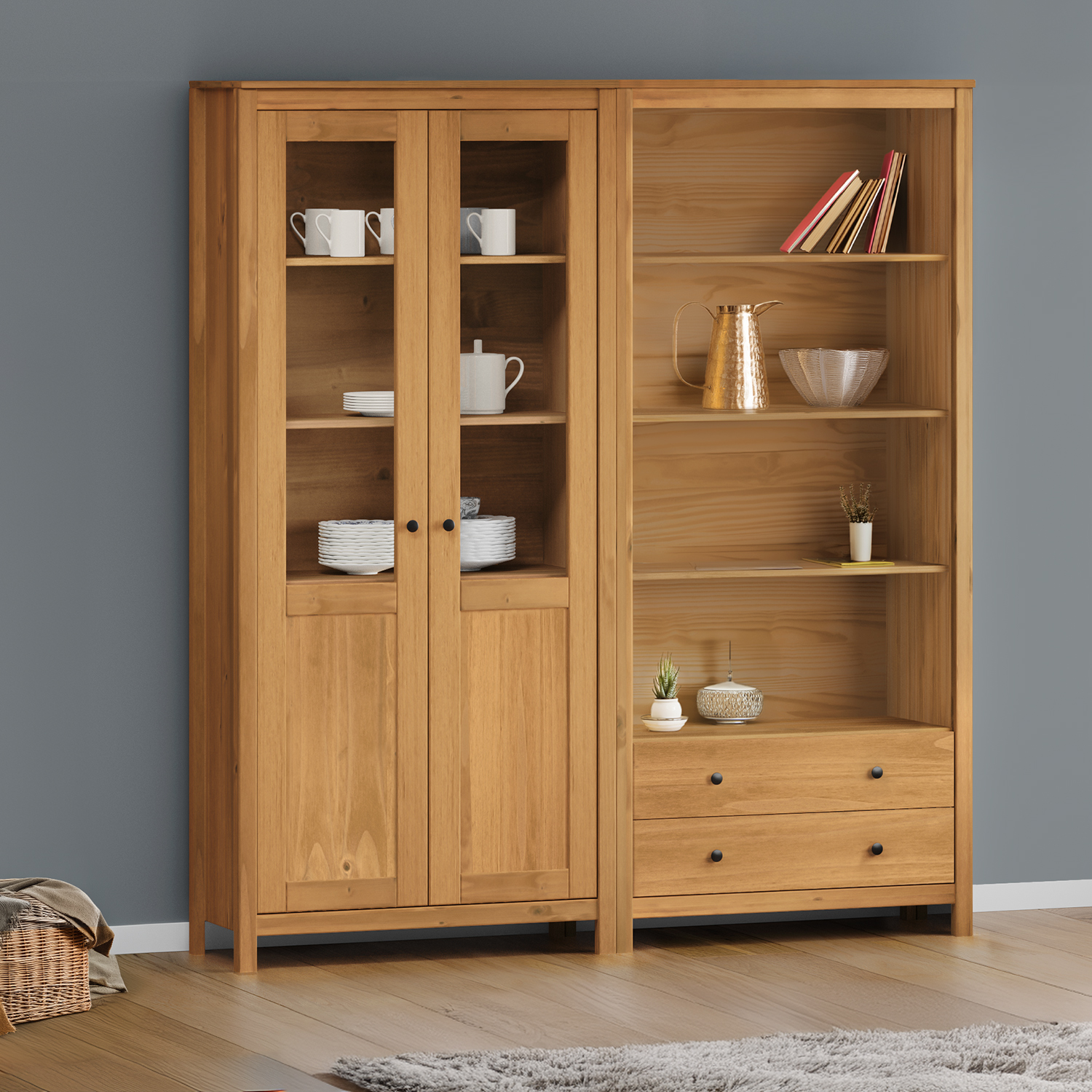 Materiálem je masiv borovice voskovaná v medovém odstínu. Nábytek je vybaven kovovými úchytkami v barevném provedení černěná mosaz. Obsahuje tři police a dvě zásuvky vybavené kovovými pojezdy.