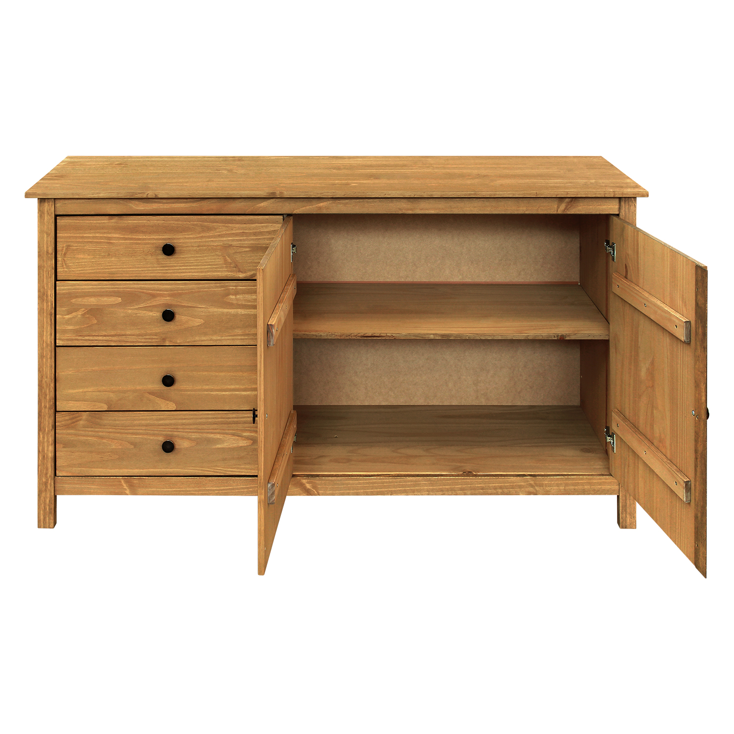 Materiál je masivní borovice s voskovaným povrchem v medovém odstínu. Kovové úchytky jsou v barevném provedení černěná mosaz. Produkt disponuje 4 zásuvkami s kovovými pojezdy, 2 plnými dveřmi a 1 policí.