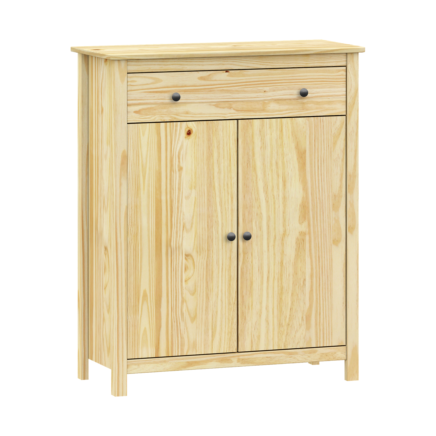 Materiál je masiv borovice v lakovaném provedení. Kovové úchytky jsou v barevném provedení černěná mosaz. Má 1 zásuvku s kovovými pojezdy, 2 plné dveře a 1 polici. Maximální nosnosti jsou uvedeny v návodu k montáži.