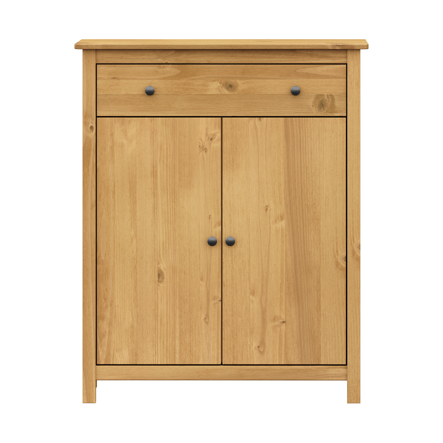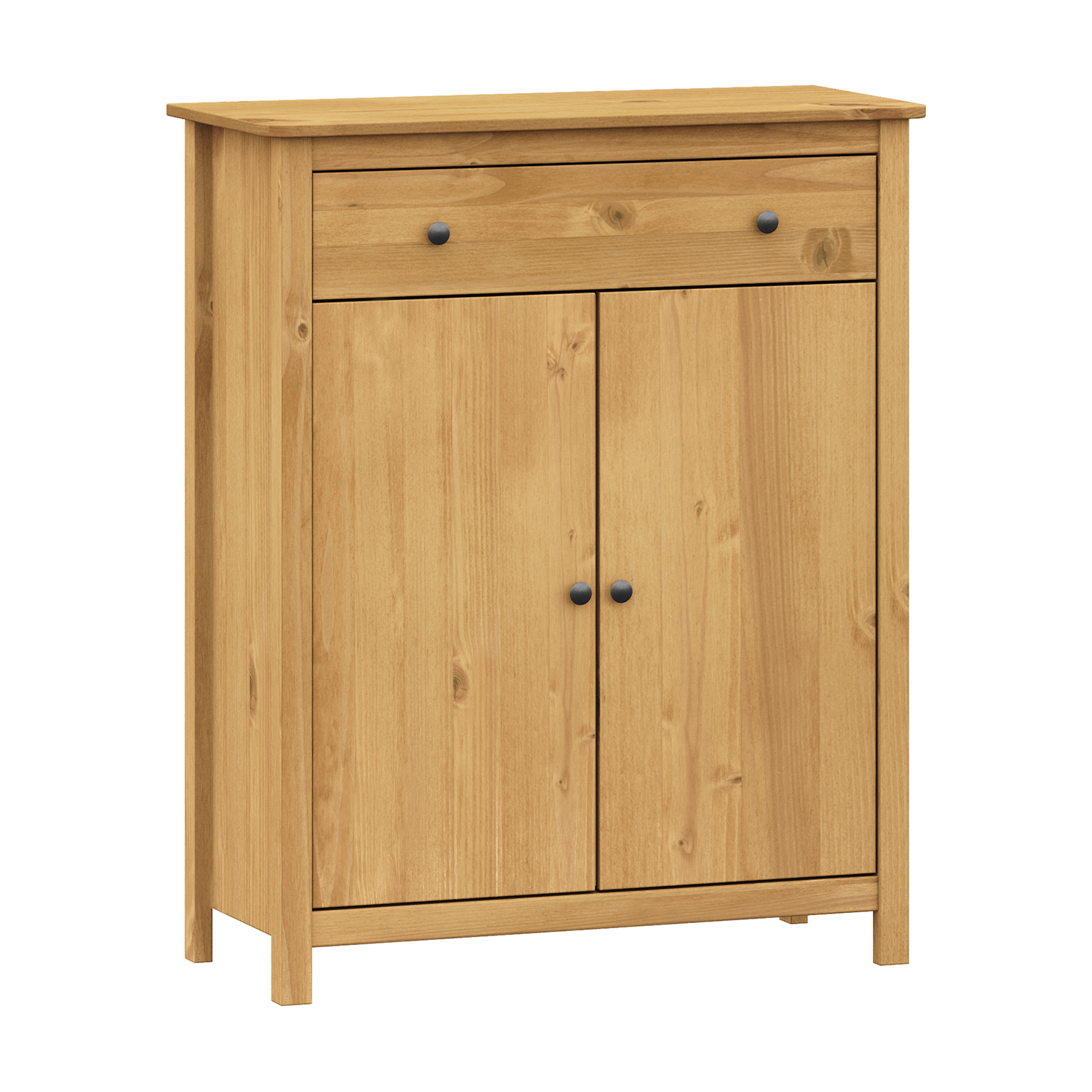 Kód produktu: 8092VMateriál je masivní borovice s voskovaným povrchem v medovém odstínu. Kovové úchytky jsou v provedení černé mozaiky. Produkt disponuje 4 zásuvkami s kovovými pojezdy, 2 plnými dveřmi a 1 policí.