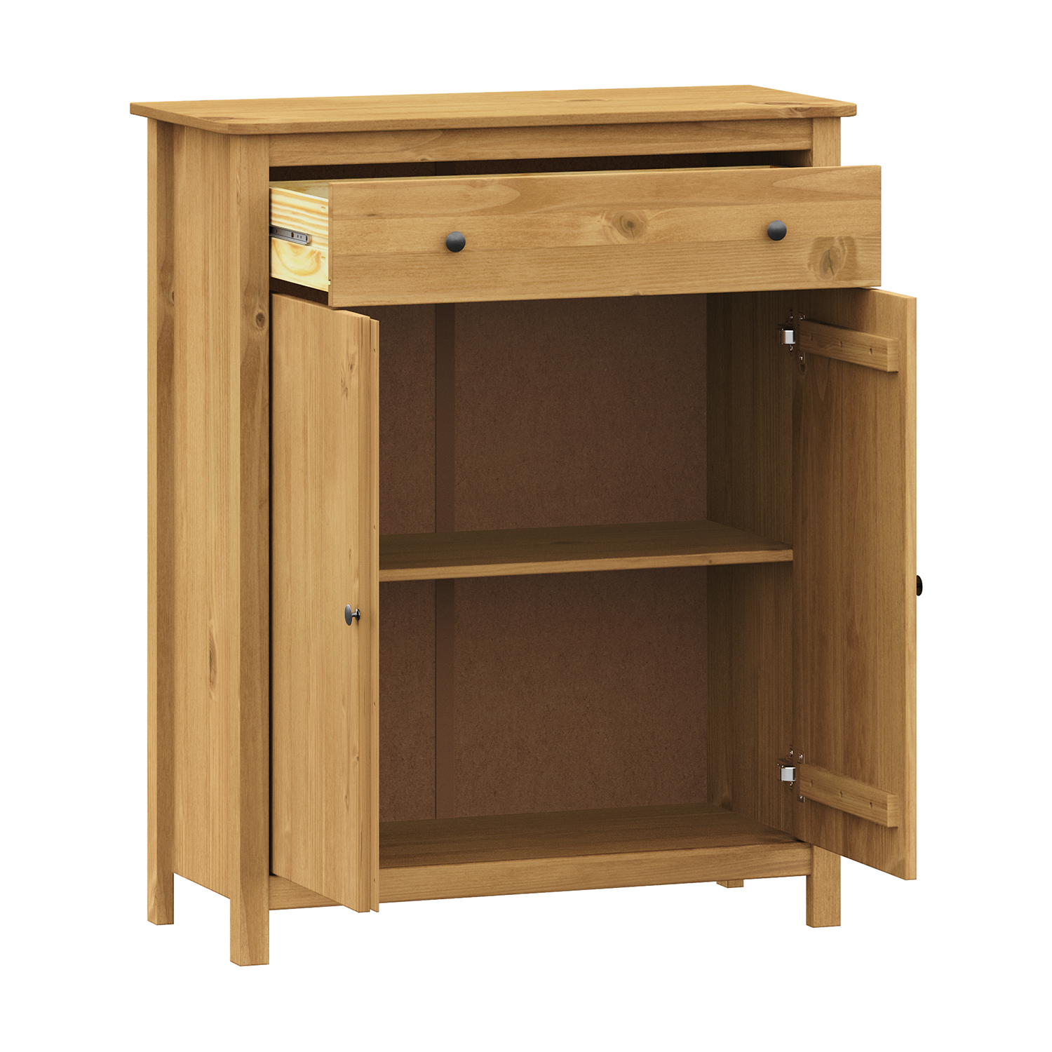 Kód produktu: 8076VMateriál je z masivu borovice voskované v medovém odstínu. Kovové úchytky jsou v barevném provedení černěná mosaz. Součástí jsou troje dvířka a dvě zásuvky s kovovými pojezdy.