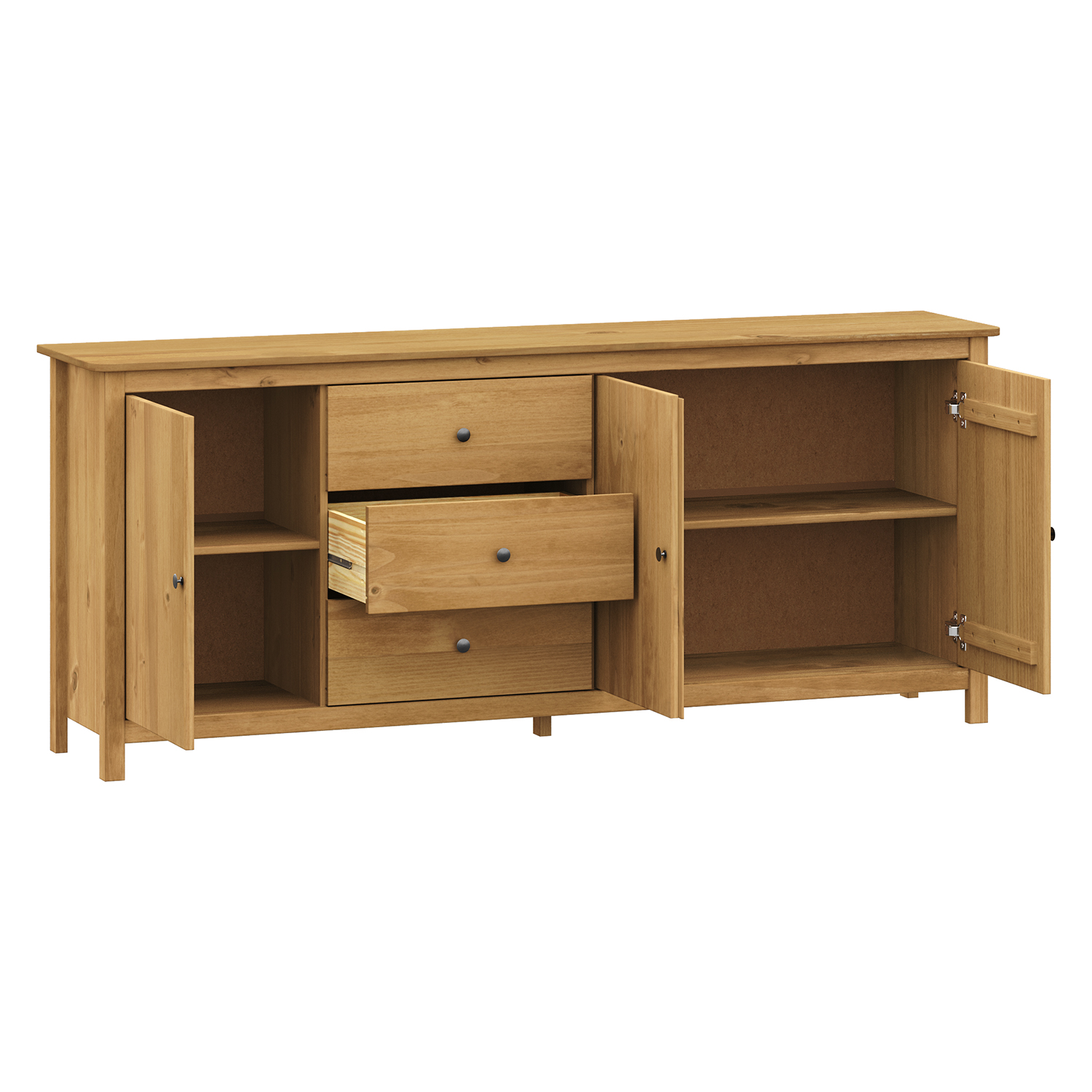 Kód produktu: 8076VMateriál je masiv borovice voskovaná v medovém odstínu. Kovové úchytky jsou v barevném provedení černěná mosaz. Součástí jsou troje dvířka a dvě zásuvky s kovovými pojezdy.