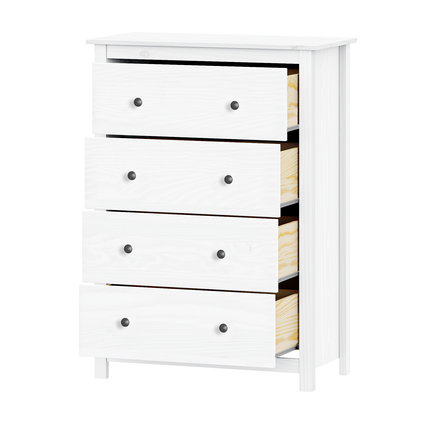 Materiál komody je masiv borovice. Je vyrobena v provedení bílý lak. Je vybavena kovovými úchytkami v barevném provedení černěná mosaz a 4 zásuvkami s kovovými pojezdy.