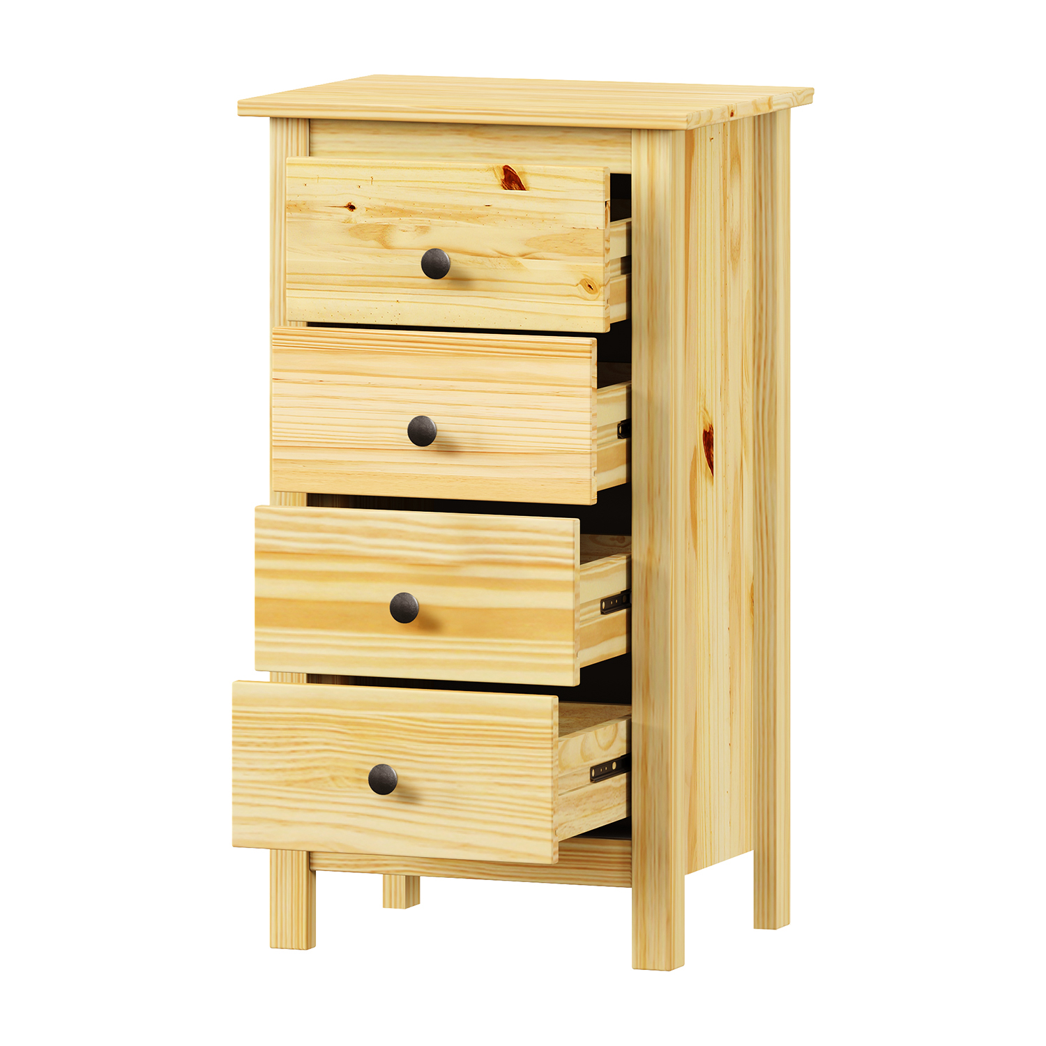 Kód produktu: 9131KNábytek je vyroben z materiálu masiv borovice v lakovaném provedení a doplněn kovovými úchytkami v barevném provedení černěná mosaz. Obsahuje čtyři zásuvky s kovovými pojezdy.