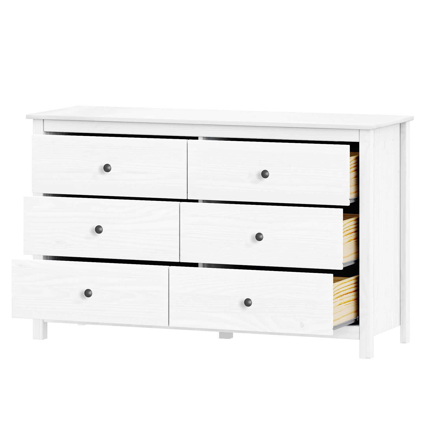 Komoda je vyrobena z masivu borovice. Je v barevném provedení bílý lak. Je vybavena kovovými úchytkami v barevném provedení černěná mosaz. Má 6 zásuvek s kovovými pojezdy. Rozměr zásuvky je (š/h/v) 52 × 33 × 19 cm.