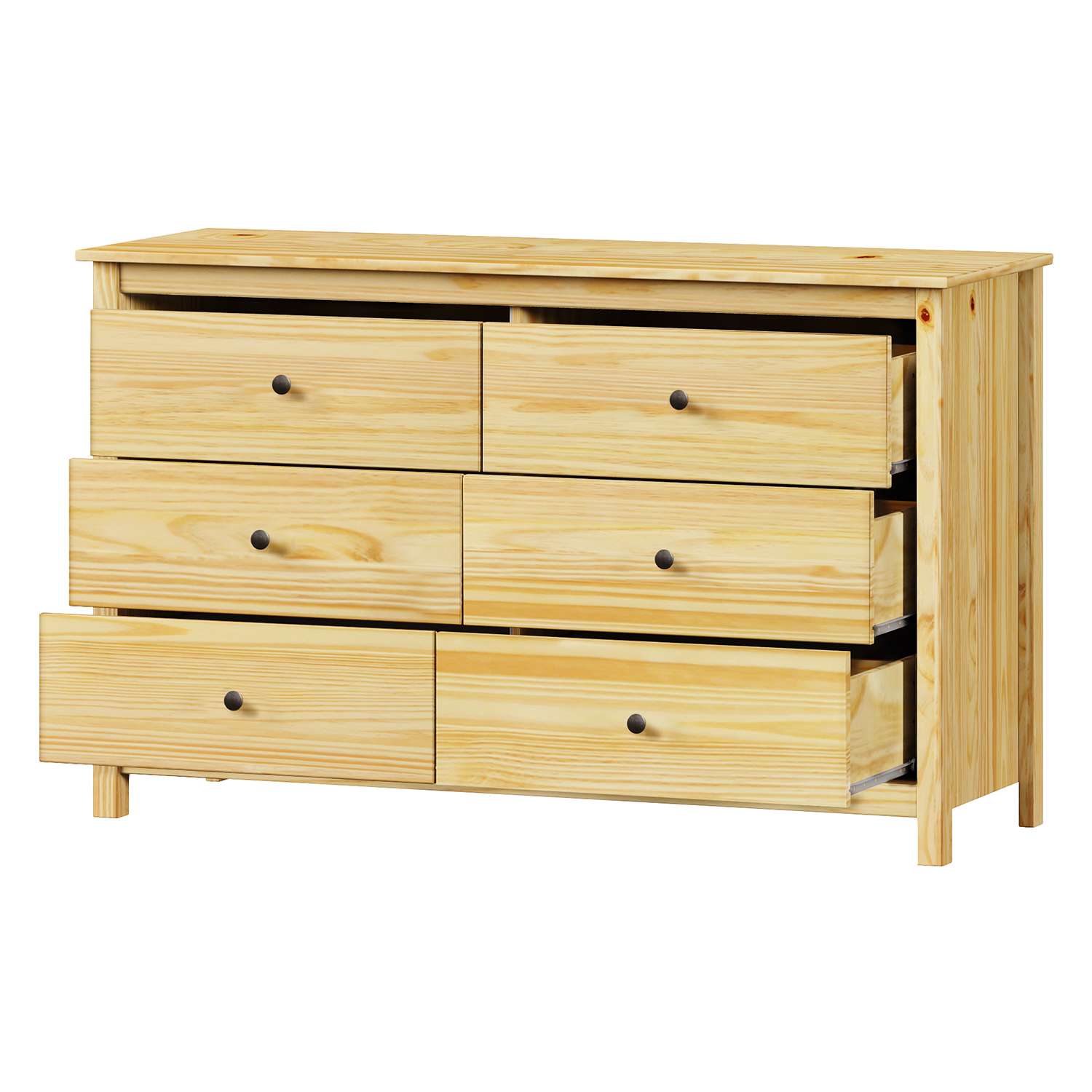 Nábytek je vyroben z materiálu masiv borovice v lakovaném provedení a doplněn kovovými úchytkami v barevném provedení černěná mosaz. Obsahuje šest zásuvek s kovovými pojezdy.