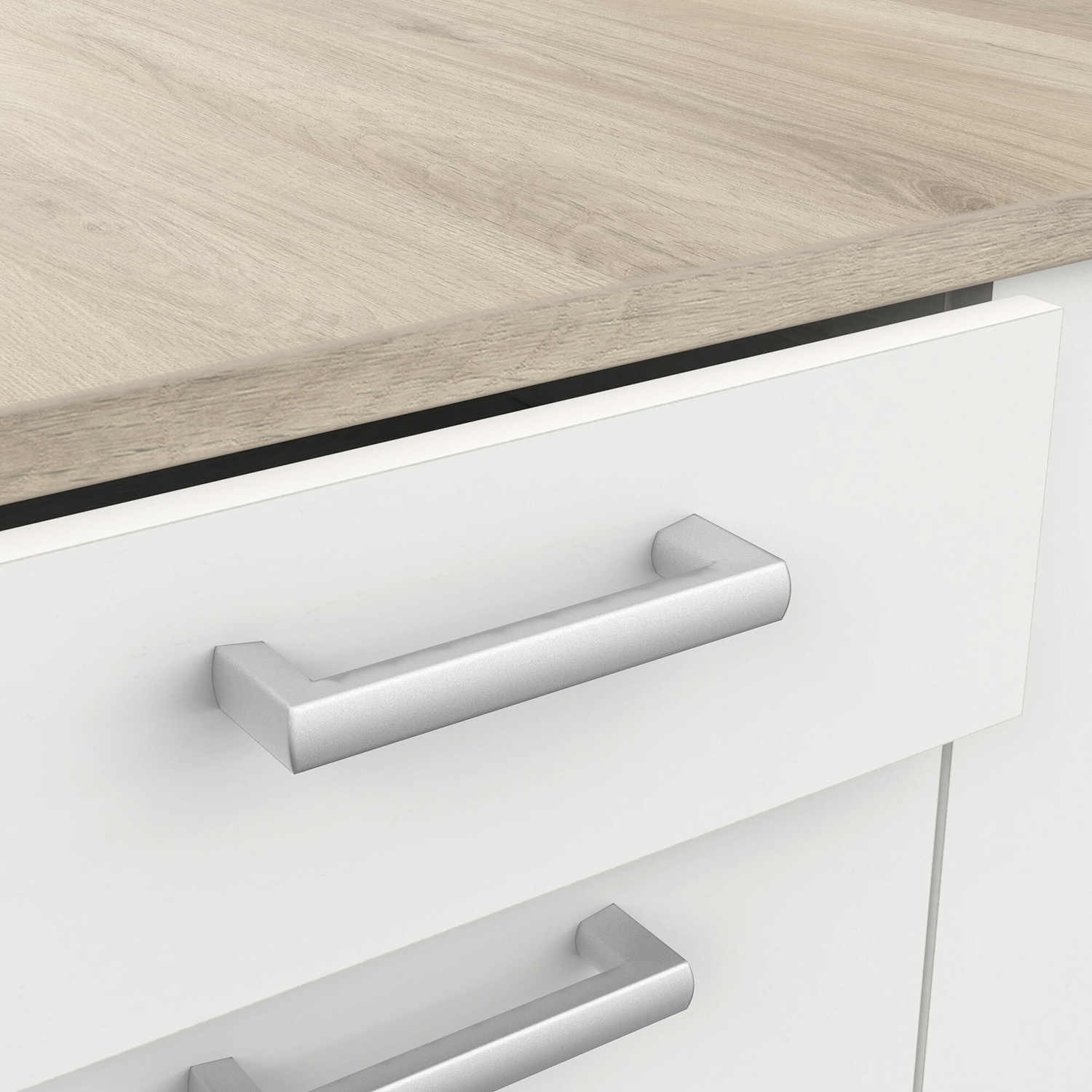 Barevné provedení dub Kronberg / matná bílá. Povrch je voděodolný, horní deska tloušťky 22 mm, nožky nastavitelné. Jedná se o 3 skříňky, které lze namontovat ve dvou variantách. Střední úzká skříňka obsahuje 1 dvířka, 1 nastavitelnou polici a 1 zásuvku s kovovými pojezdy s maximální nosností zásuvky 1 kg. Široká skříňka má 2 dvířka, je vhodná pro dřezy až do šířky 80 cm a má zkrácená záda pro sanitární vedení. Otevřená police obsahuje 1 nastavitelnou polici, 1 zásuvku s kovovými pojezdy, kterou lze umístit v horní nebo dolní části skříňky s maximální nosností zásuvky 2 kg. Je vhodná pro vestavné spotřebiče o šířce 60 cm. Na horní desku lze umístit dřez o šířce až 80 cm a varnou desku o šířce 60 cm. Vhodným doplňkem je závěsná skříňka s označením 300433.
