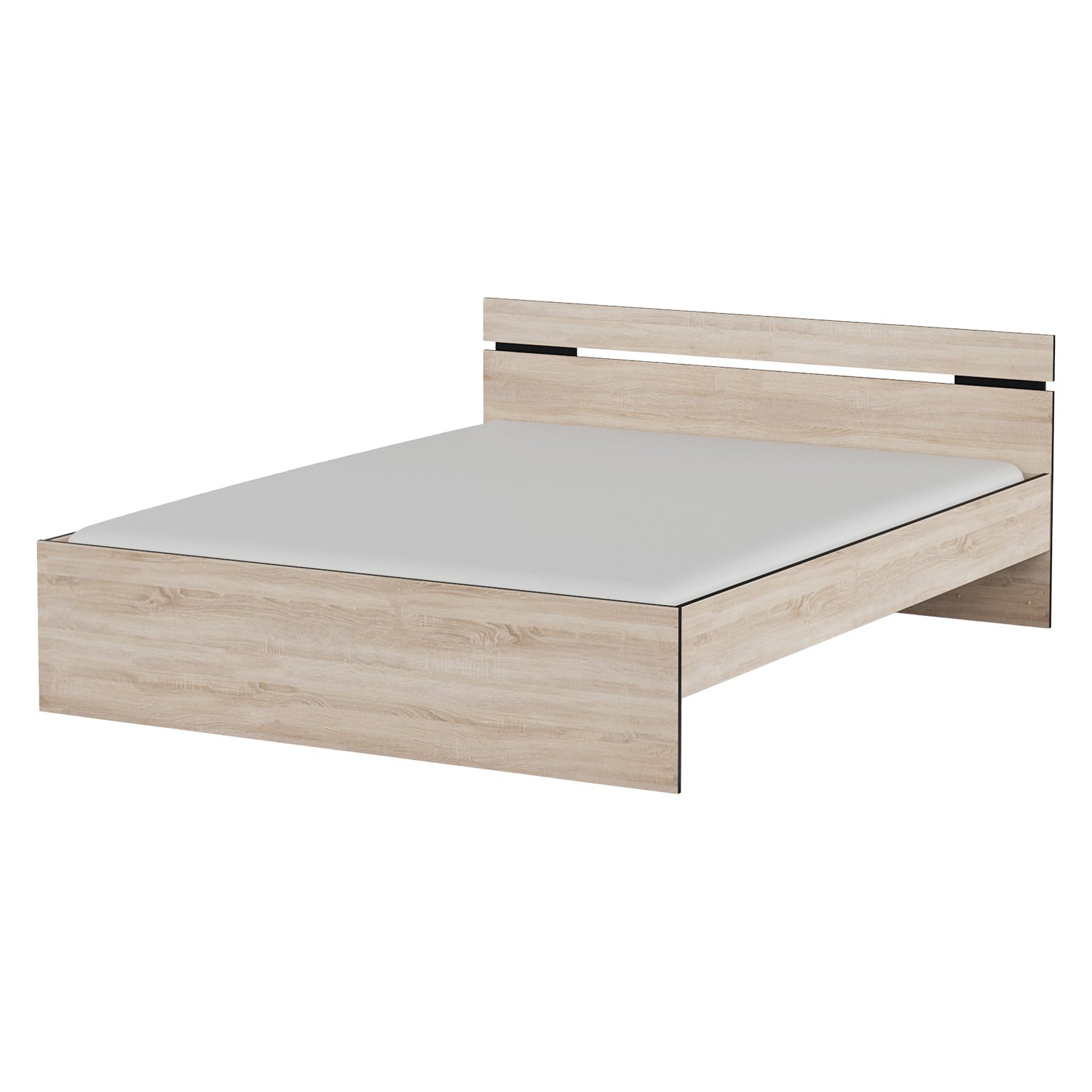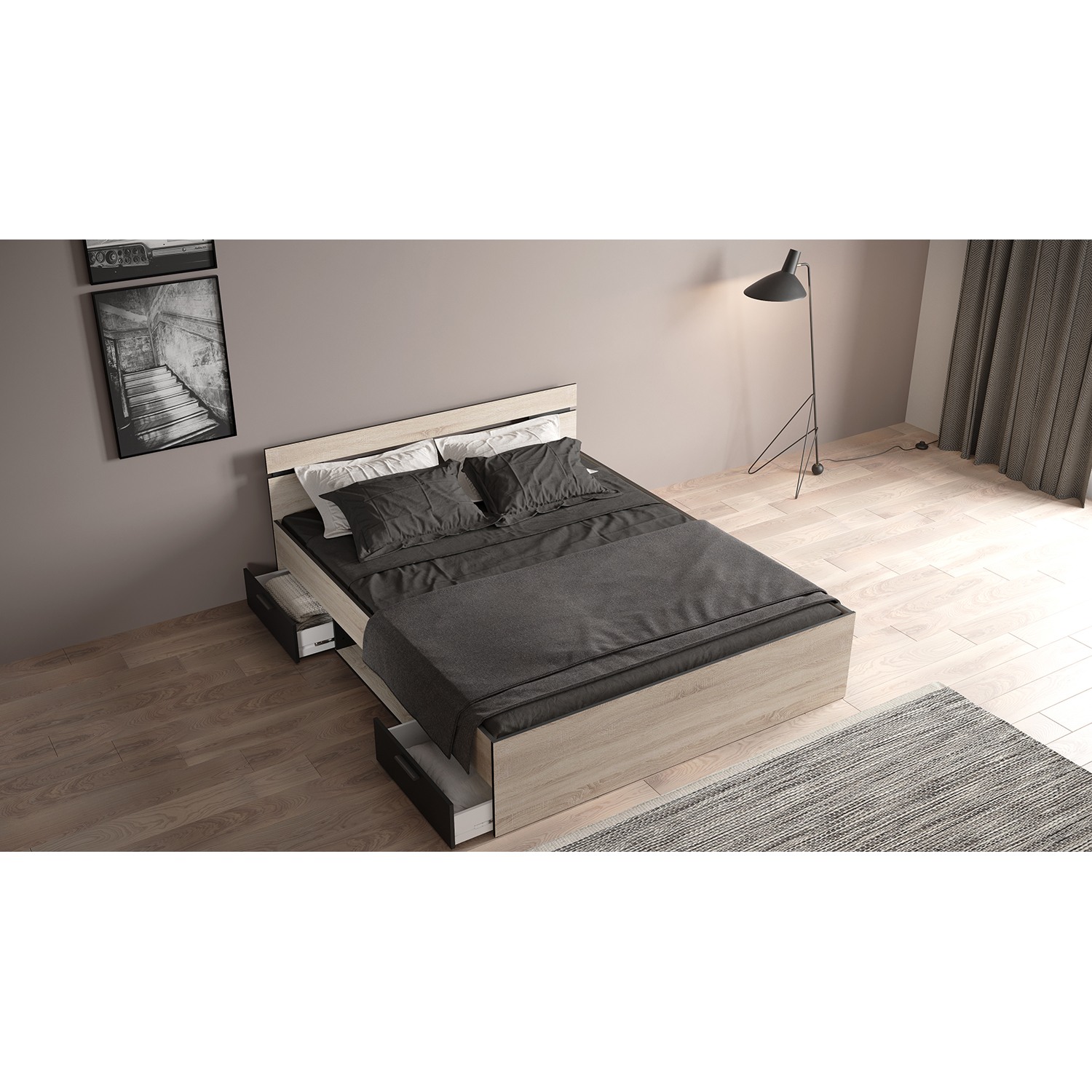 Barevné provedení je v odstínech dub Sonoma a matná černá. Postel obsahuje dvě úložné zásuvky s kovovými pojezdy. Rozměr jedné zásuvky je šířka 56 cm, výška 11 cm a hloubka 33 cm. Rozměr niky je šířka 80 cm, výška 20 cm a hloubka 36 cm. Zásuvky i nika jsou zahrnuty v ceně. Matrace a rošt nejsou v ceně. Doporučený rozměr matrace je 160 × 200 cm nebo dvě matrace o rozměru 80 × 200 cm. K posteli je nutné použít samonosný rošt v rámu o rozměru 160 × 200 cm. Doporučená maximální nosnost je dvakrát 100 kg.