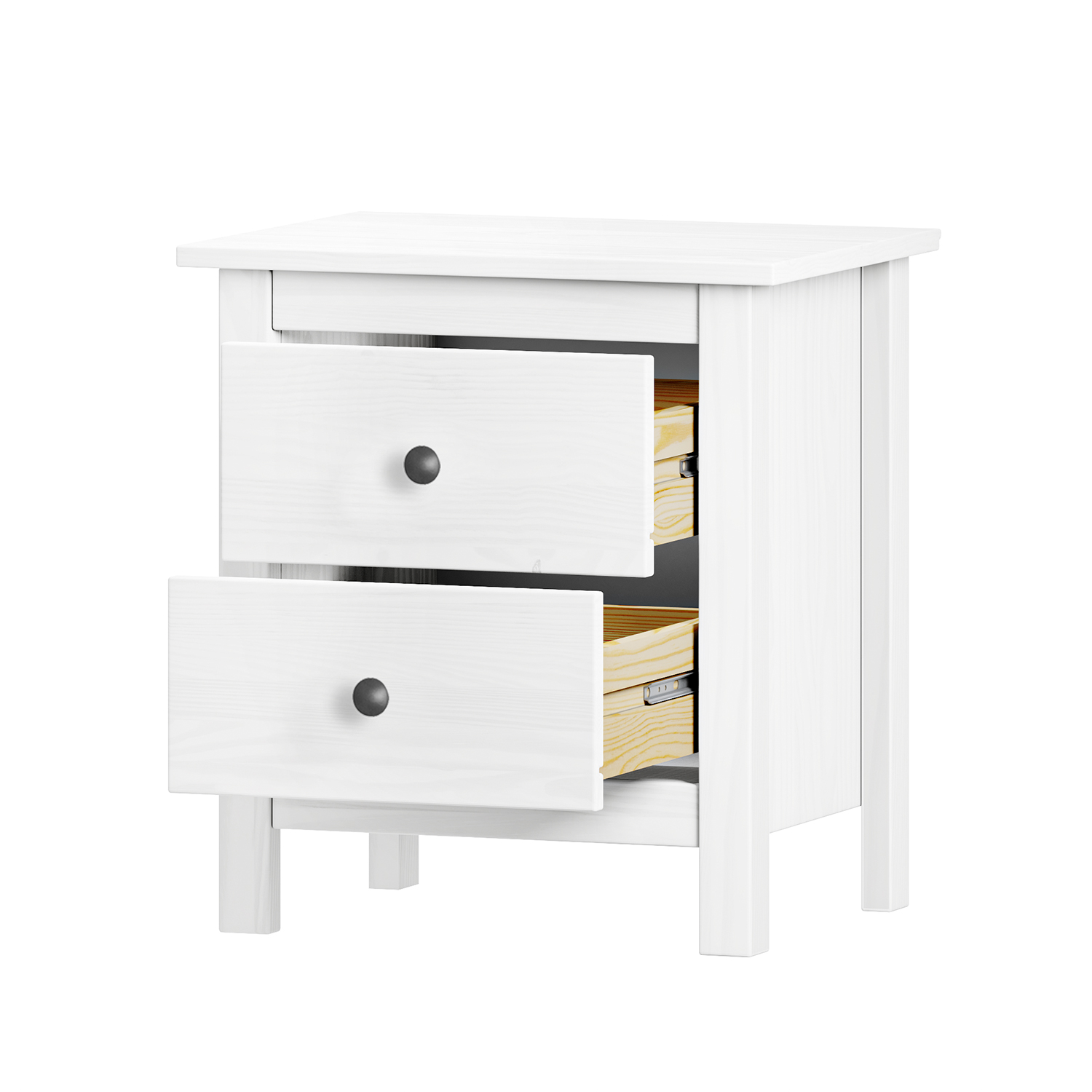 Noční stolek je vyroben z masivu borovice. Je v barevném provedení bílý lak. Je vybaven kovovými úchytkami v barevném provedení černěná mosaz. Má 2 zásuvky s kovovými pojezdy.