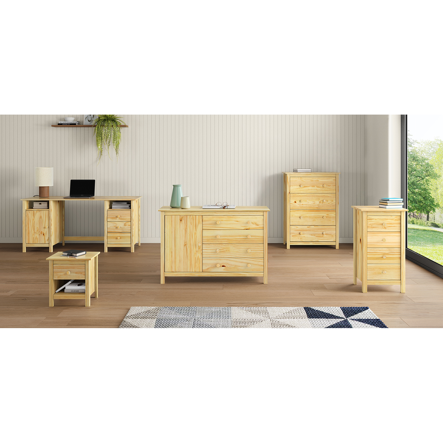 Noční stolek je vyroben z masivní borovice, která má povrch pokrytý lakem pro ochranu a estetiku. Součástí je jedna zásuvka vybavená kovovými pojezdy pro plynulý pohyb.