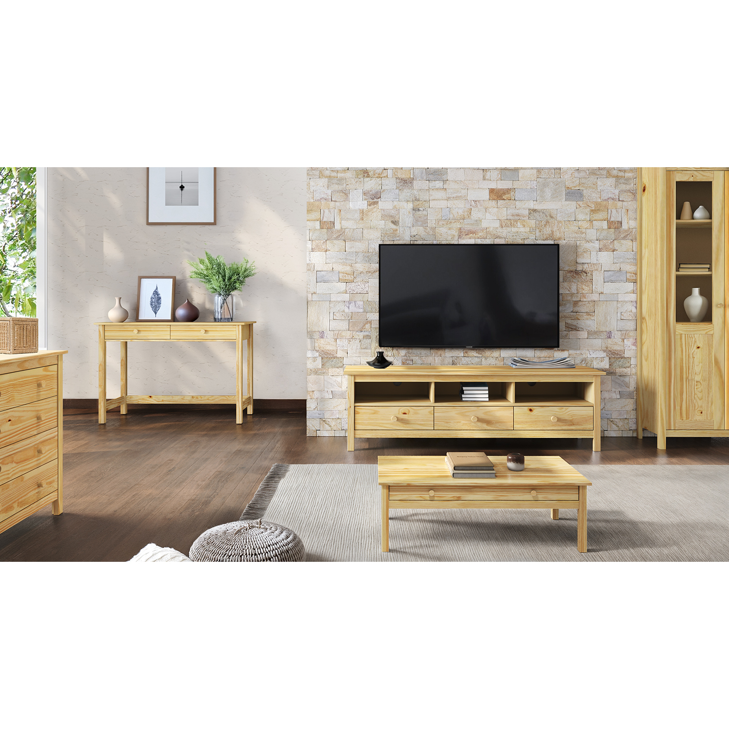 TV stolek TORINO v provedení masiv borovice lak je ideální do obývacího pokoje zařízeného masivním nábytkem, především nábytkem ze sestavy TORINO. TV stolek obsahuje 3 zásuvky s kovovými pojezdy, do kterých uložíte dálkové ovladače a 3 otevřené police na umístění DVD přehrávače nebo set-top boxu.