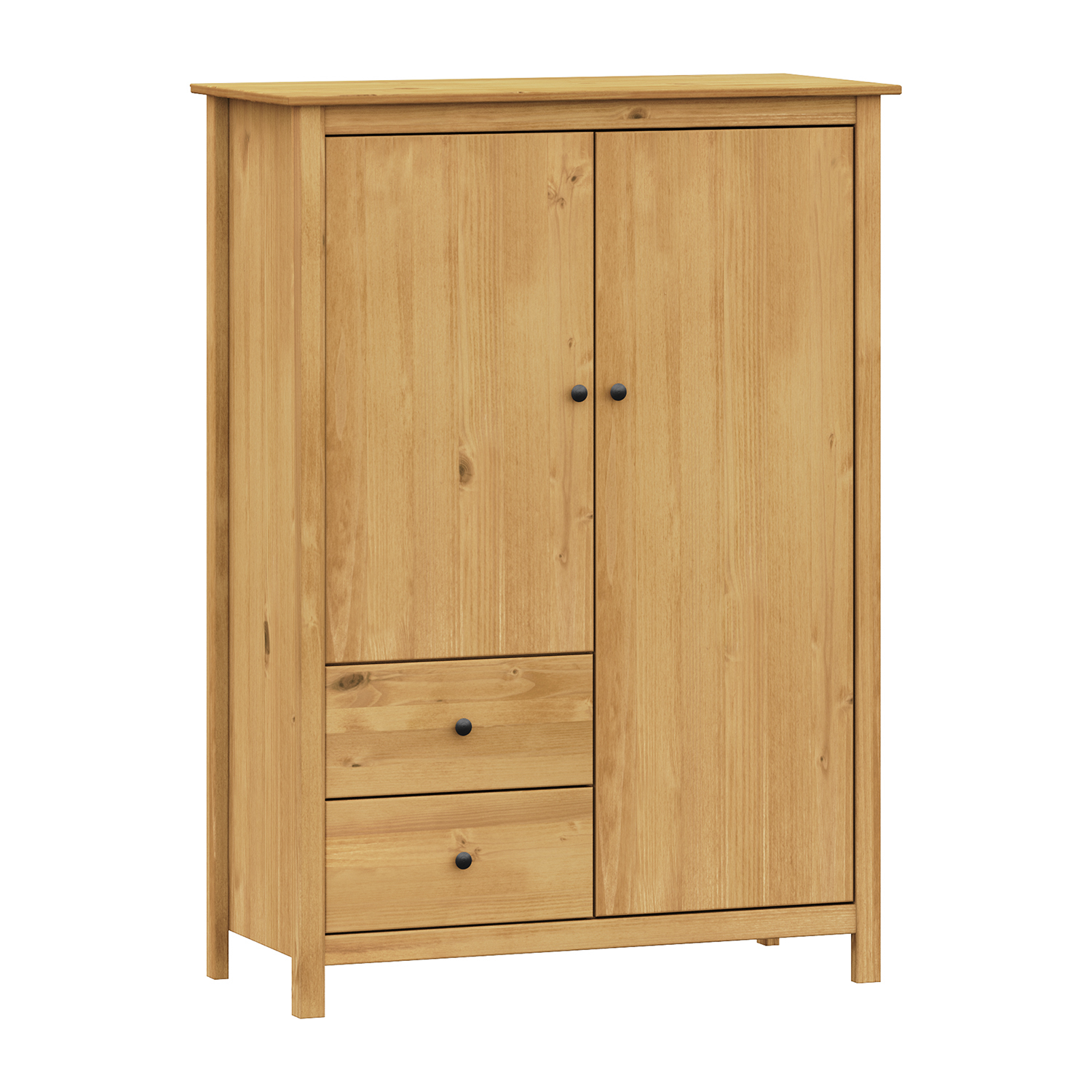 Materiál je z masivu borovice voskované v medovém odstínu. Kovové úchytky jsou v barevném provedení černěná mosaz. Součástí jsou dvě dvířka a dvě zásuvky s kovovými pojezdy.
