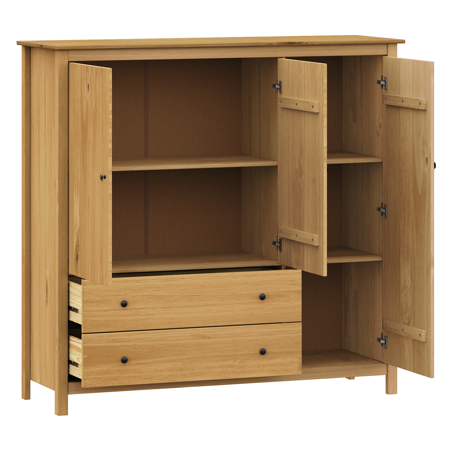 Kód produktu: 8061VKomoda je vyrobena z masivu borovice voskované v medovém odstínu. Je doplněna kovovými úchytkami v barevném provedení černěná mosaz. Součástí jsou tři zásuvky s kovovými pojezdy, troje plné dveře a dvě police. Maximální nosnosti jednotlivých částí jsou uvedeny v návodu k montáži.