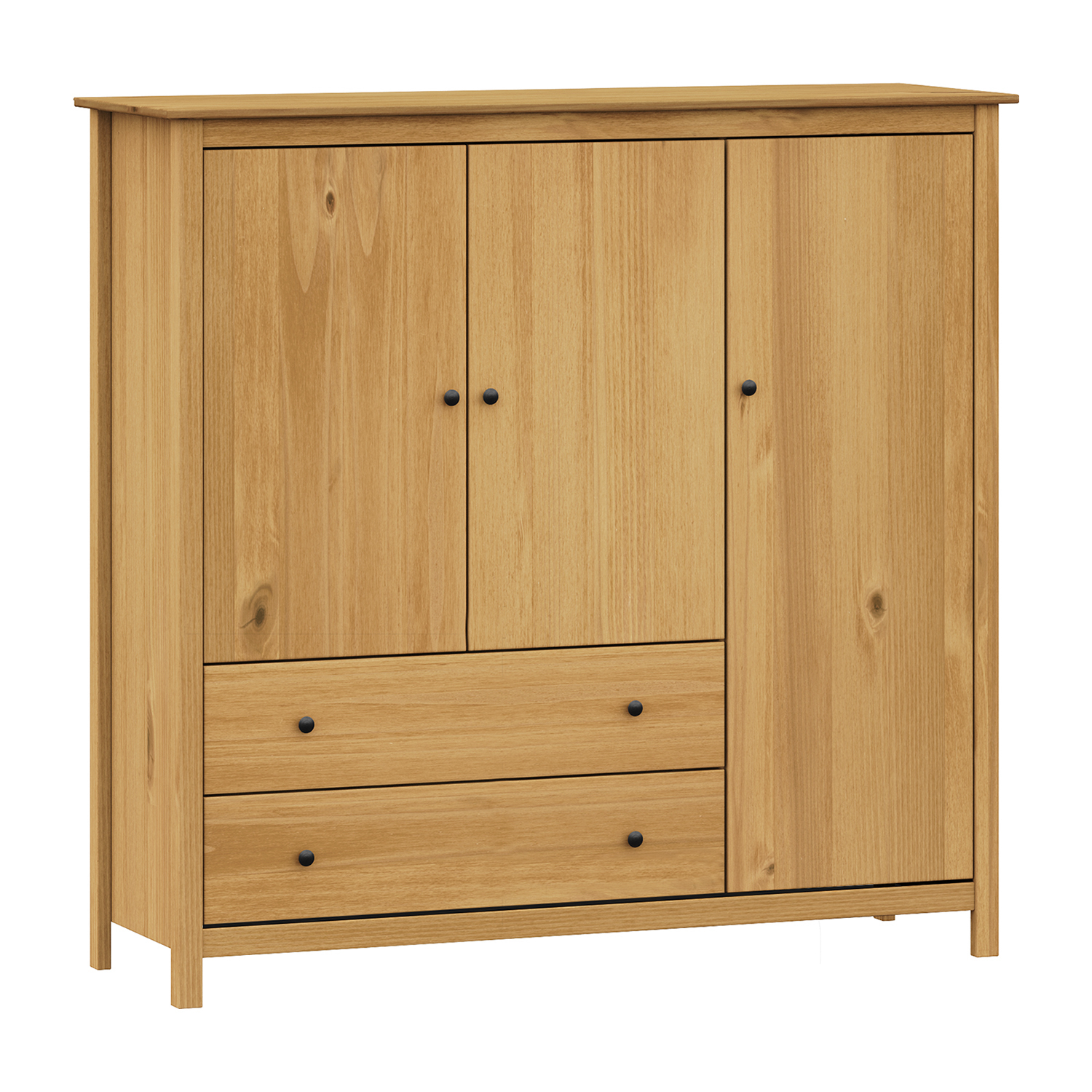 Materiál je z masivu borovice voskované v medovém odstínu. Kovové úchytky jsou v barevném provedení černěná mosaz. Součástí jsou troje dvířka a dvě zásuvky s kovovými pojezdy.