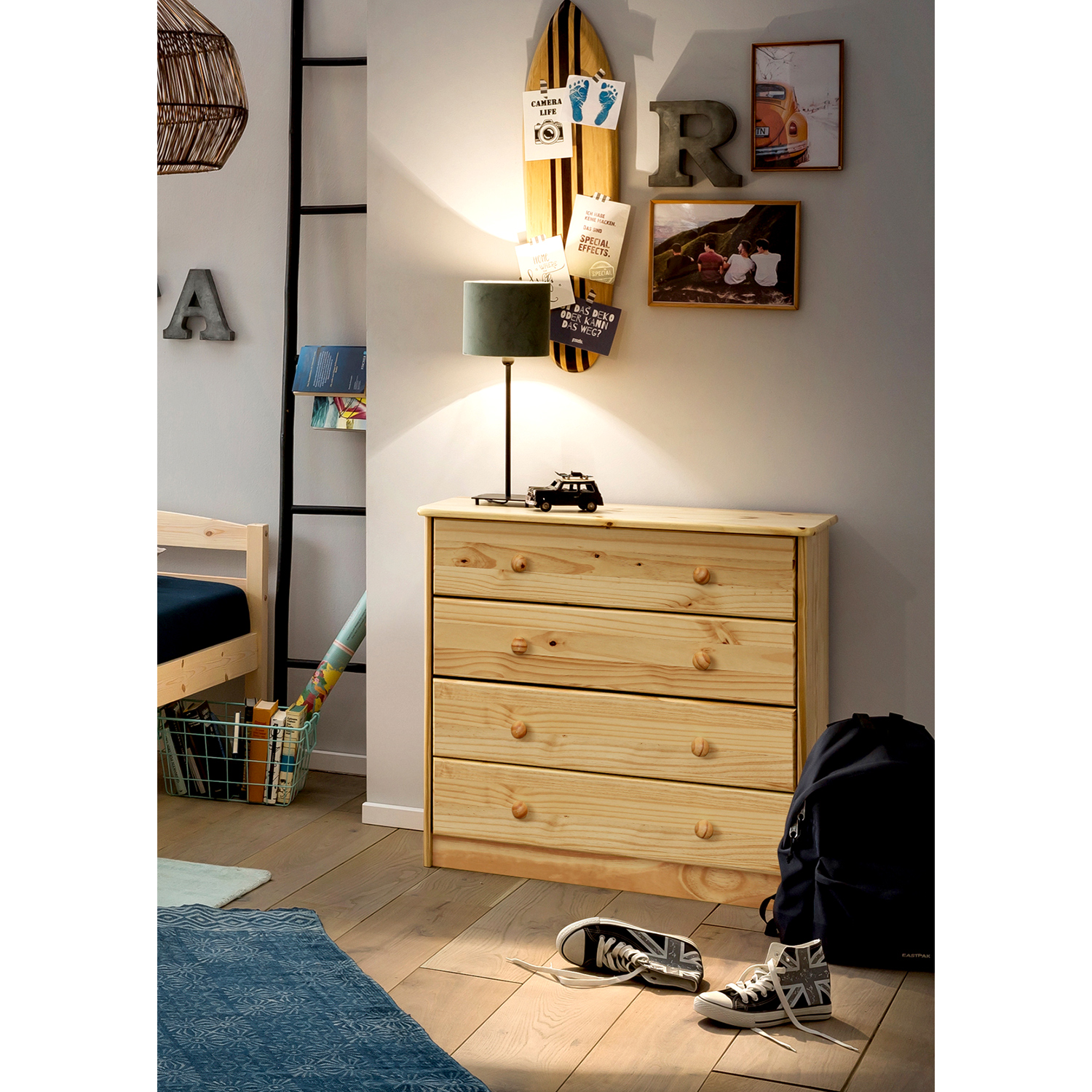 Prádelník 4 zásuvky 8034 lak v provedení masiv borovice je pomocníkem v každé domácnosti. Přehledně uspořádané prádlo a osušky nemusí zabírat místo ve skříni. Prádelník má 4 široké zásuvky s kovovými pojezdy. Hloubka zásuvky je 32,5 cm. Prádelník je vhodný do každé ložnice s masivním nábytkem.