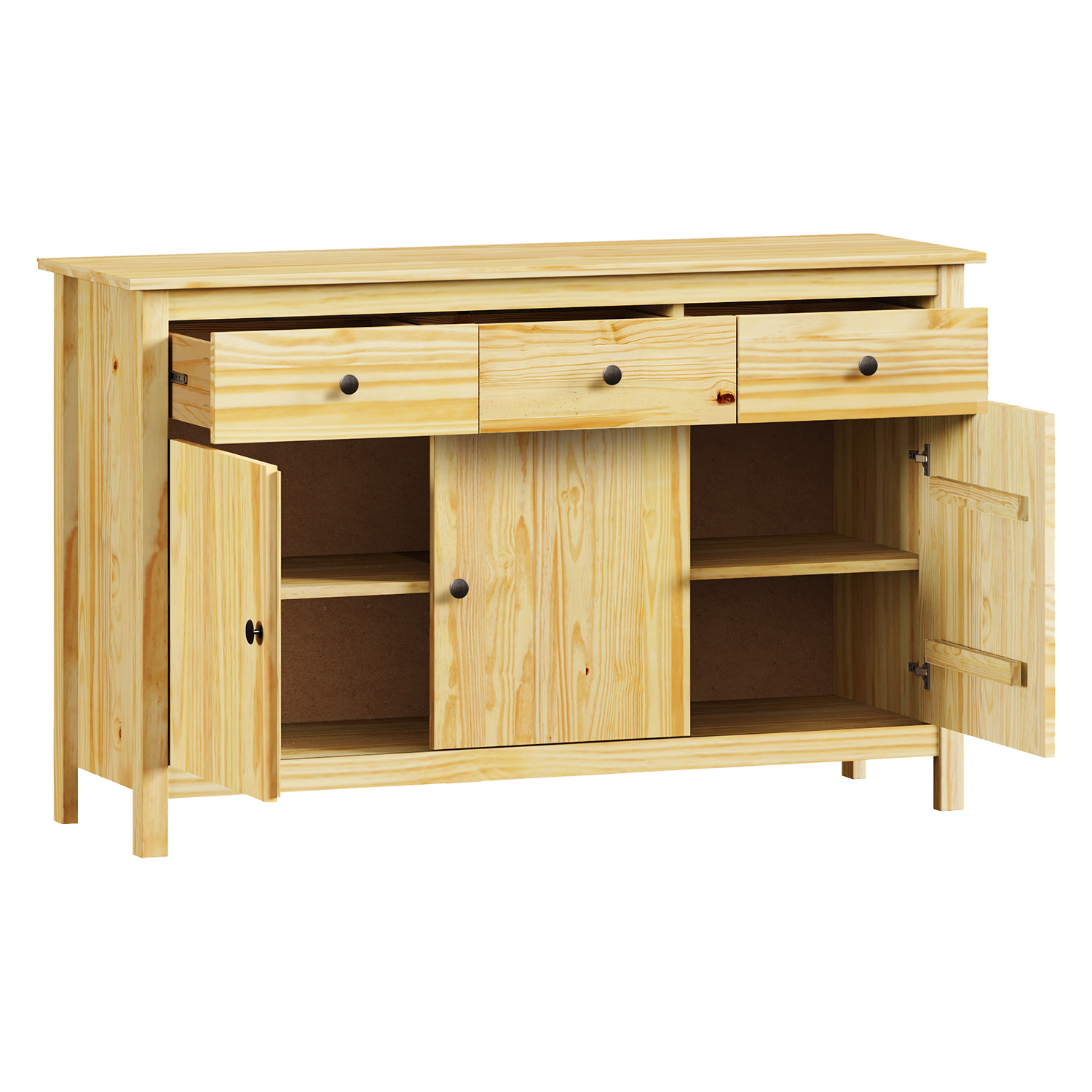 Kód produktu: 8061KMateriál je masiv borovice v lakovaném provedení. Kovové úchytky jsou v barevném provedení černěná mosaz. Má 3 zásuvky s kovovými pojezdy, 3 plné dveře a 2 police. Maximální nosnosti jsou uvedeny v návodu k montáži.