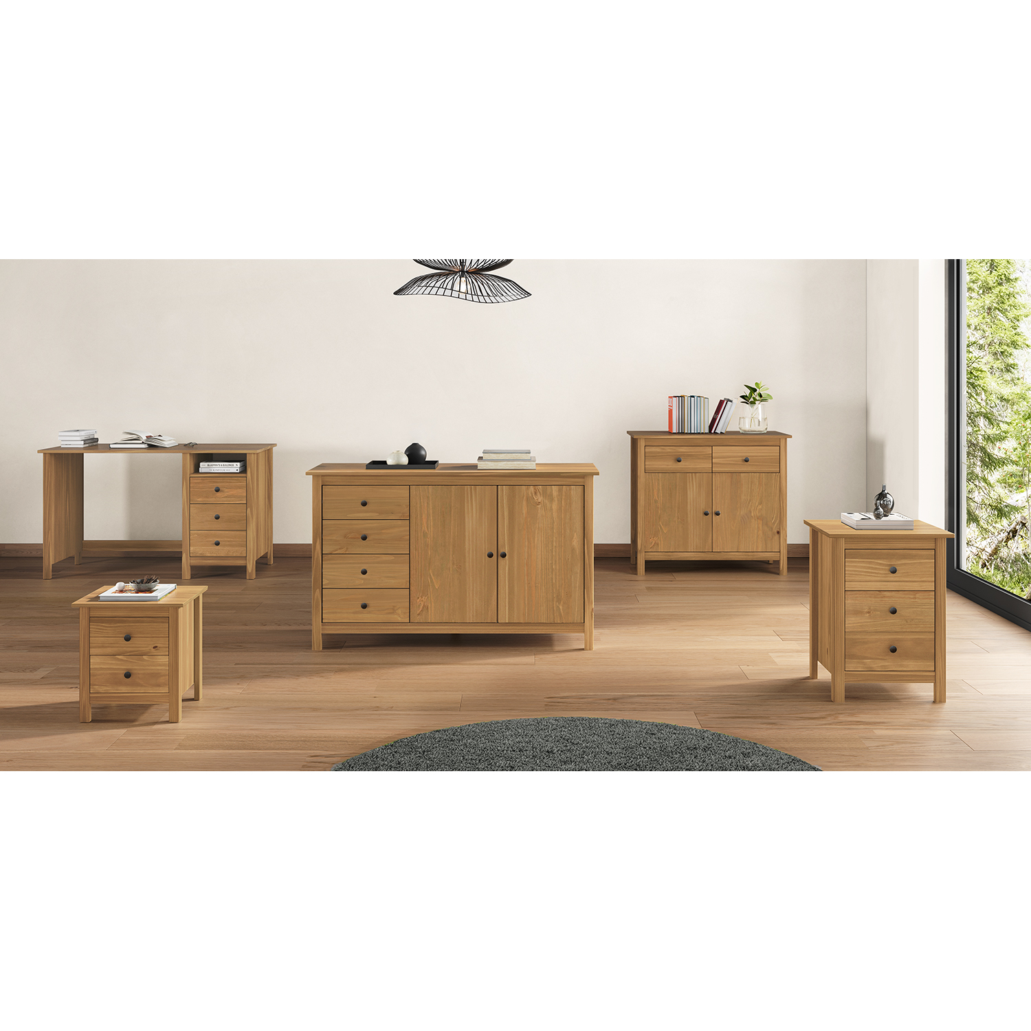 Materiálem je masiv borovice, povrch je voskovaný v medovém odstínu. Příborník je vybaven kovovými úchytkami v barevném provedení černěná mosaz. Obsahuje 2 zásuvky s kovovými pojezdy, 2 plné dveře a 1 polici. Jako vhodný doplněk se doporučuje nástavec s označením 8096V.