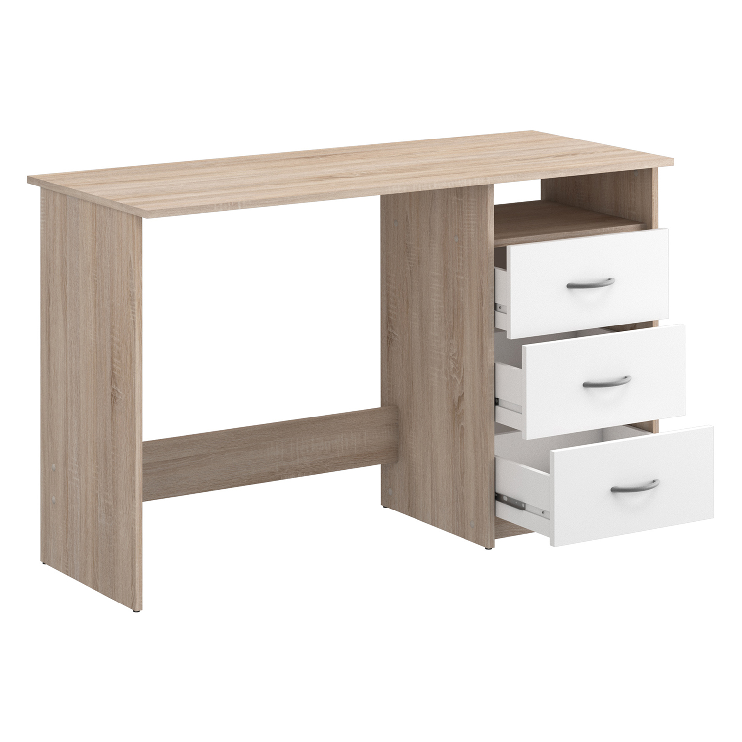 Psací stůl dub Sonoma / matná bílá nabízí dostatečnou pracovní plochu, 3 zásuvky s kovovými pojezdy a otevřenou polici v rozměru 40 × 36 × 13 cm k odložení věcí. Montáž zásuvek je možná na pravou i levou stranu. Rozměr zásuvky je (š/h/v) 37 × 31 × 10 cm, výška čela zásuvky je 18,7 cm. Maximální nosnost horní desky stolu je 30 kg.