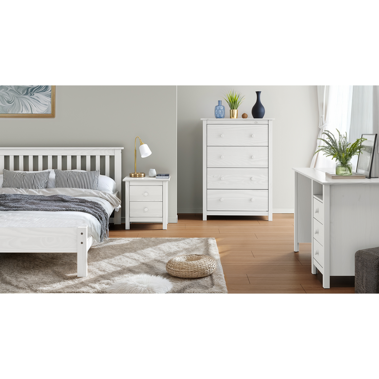 Materiálem tohoto kusu nábytku je masiv borovice s bílým lakem. Obsahuje 3 zásuvky vybavené kovovými pojezdy a 1 polici.