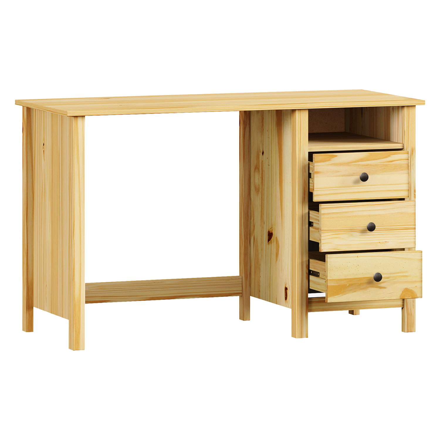 Kód produktu: 8073KNábytek je vyroben z masivu borovice v lakovaném provedení a je doplněn kovovými úchytkami v barevném provedení černěná mosaz. Obsahuje 2 otevřené police, 1 dvířka a 3 zásuvky s kovovými pojezdy. Výsuv není součástí dodávky. Ke stolu je možno dokoupit výsuvnou desku na klávesnici 8840.