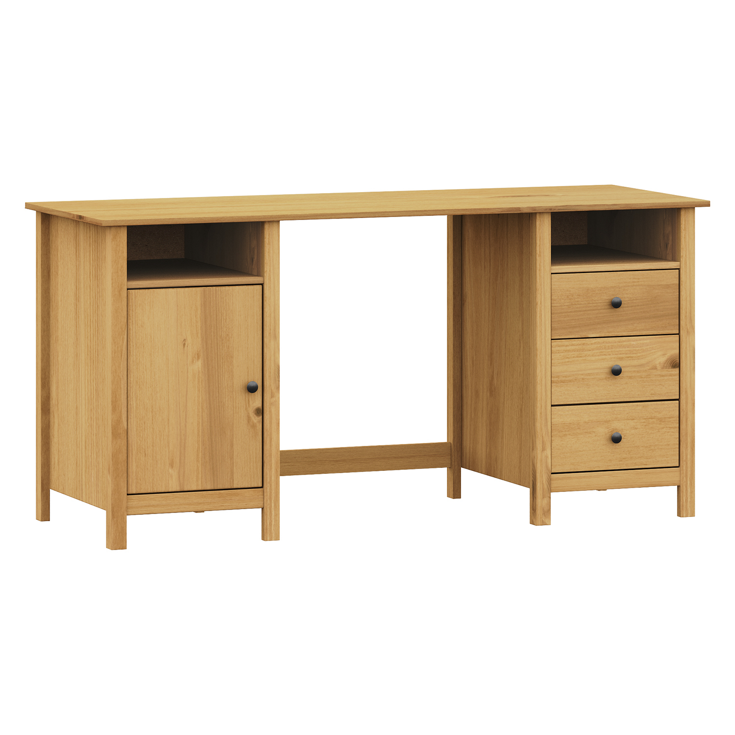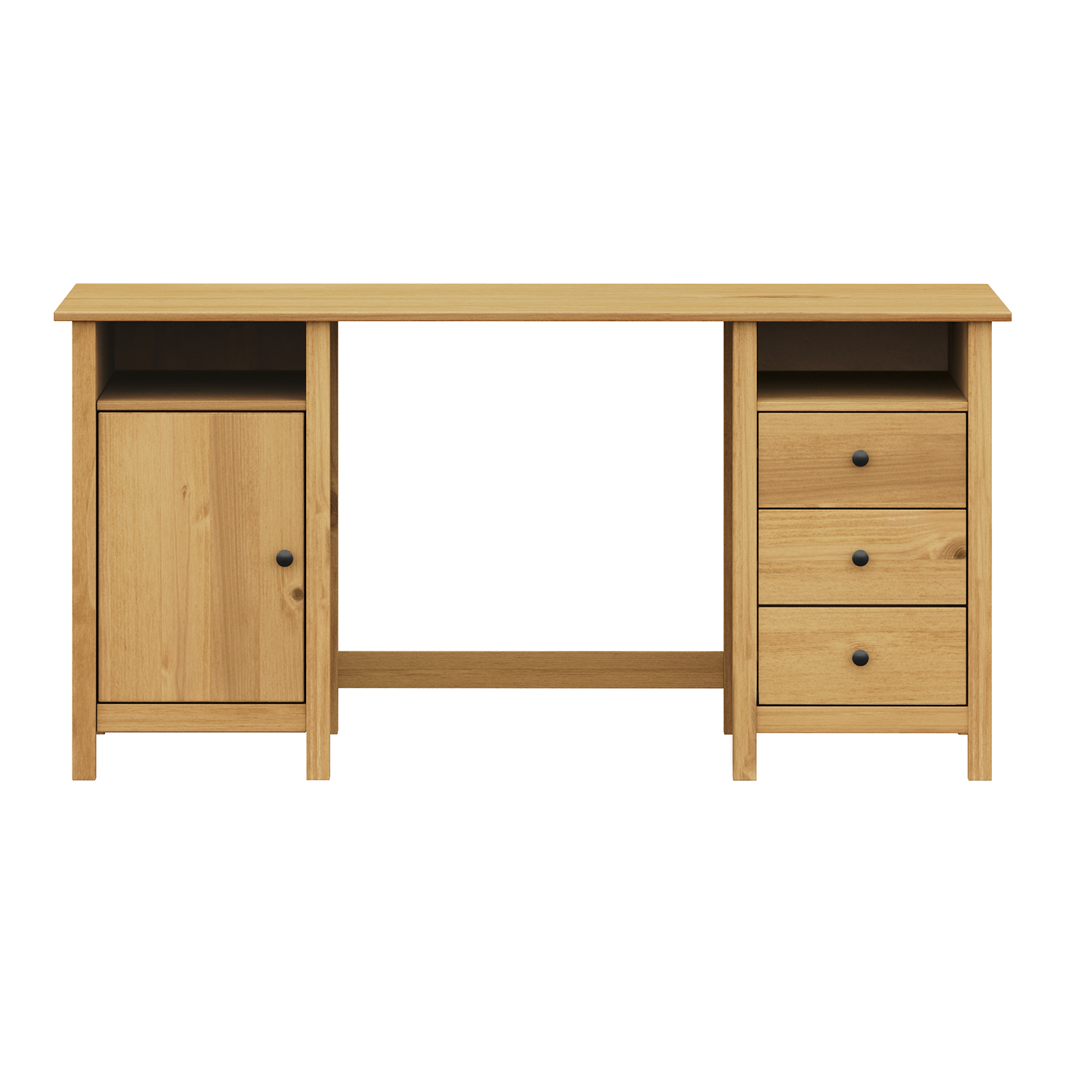 Materiál je z masivu borovice voskované v medovém odstínu. Kovové úchytky jsou v barevném provedení černěná mosaz. Součástí jsou dvě otevřené police, jedny dvířka a tři zásuvky s kovovými pojezdy.
