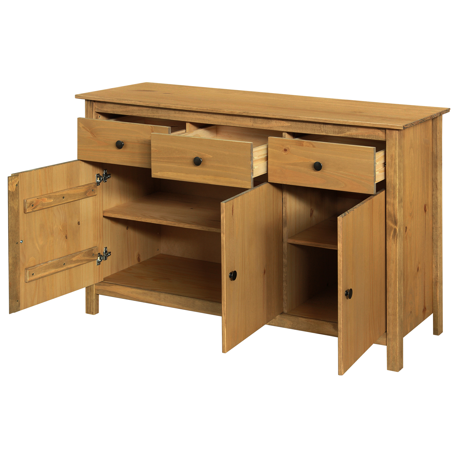 Kód produktu: 8061VNábytek je vyroben z masivu borovice voskované v medovém odstínu. Je doplněn kovovými úchytkami v barevném provedení černěná mosaz. Součástí jsou tři zásuvky s kovovými pojezdy, troje plné dveře a dvě police. Maximální nosnosti jednotlivých částí jsou uvedeny v návodu k montáži.