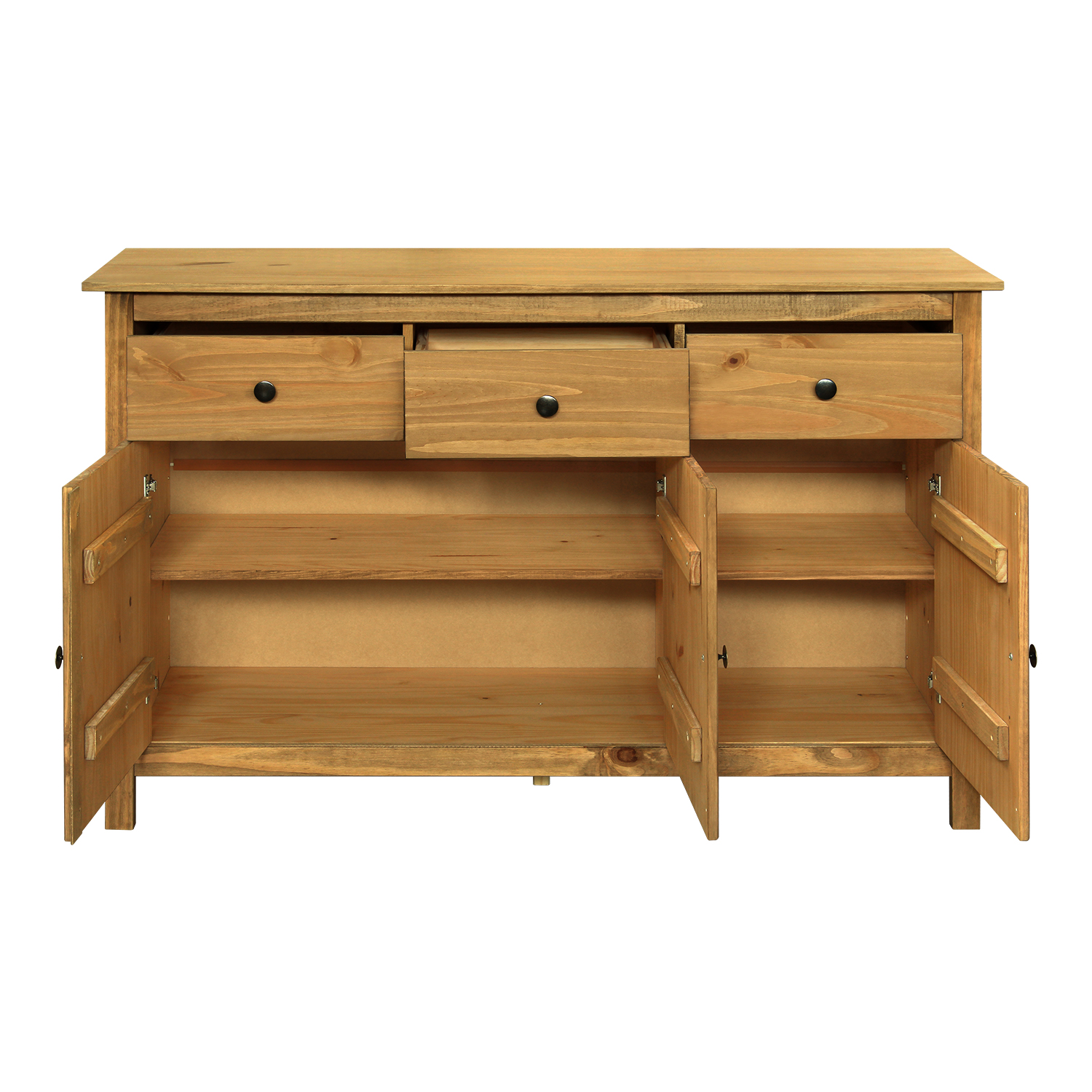 Kód produktu: 8097VMateriál je masivní borovice s voskovaným povrchem v medovém odstínu. Kovové úchytky jsou v barevném provedení černěná mosaz. TV stolek obsahuje 3 zásuvky s kovovými pojezdy.