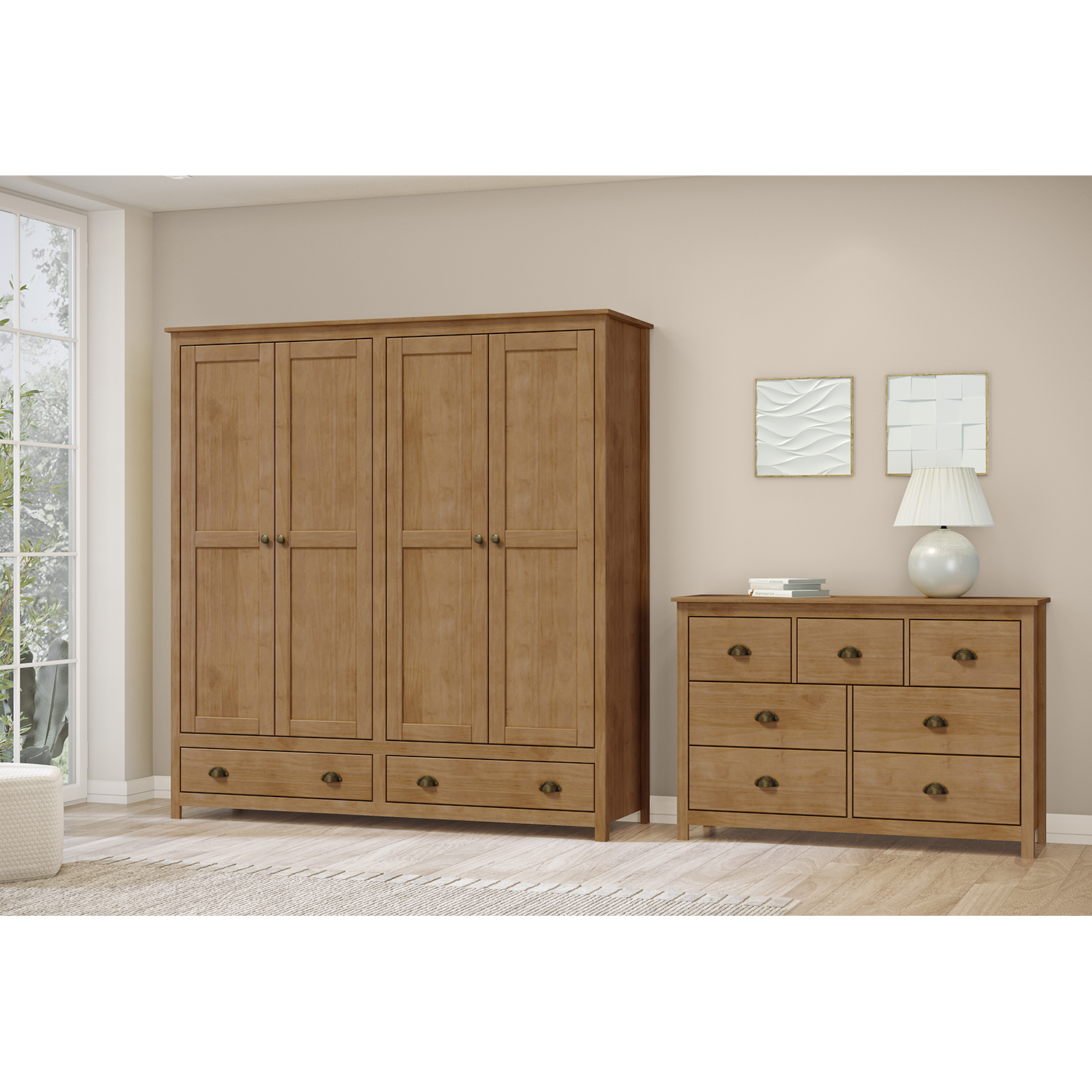 Nábytek je vyroben z masivu borovice v barevném provedení dub. Obsahuje dvě zásuvky s kovovými úchytkami a pojezdy. V levé části se nacházejí tři police, v pravé části jedna police a kovová šatní tyč.