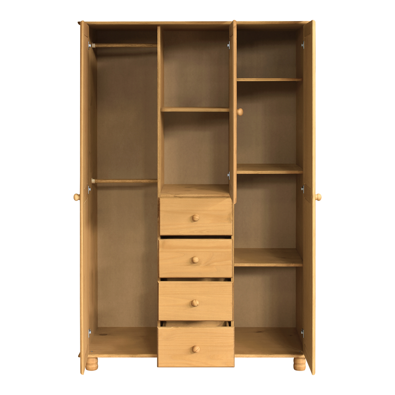 Materiál je masiv borovice. Je voskovaný v medovém odstínu. Na levé straně jsou 2 šatní tyče, na pravé straně jsou 3 police. Uprostřed je jedna police a 4 zásuvky s kovovými pojezdy. Jako doplněk je možné dokoupit nástavec 8864V.