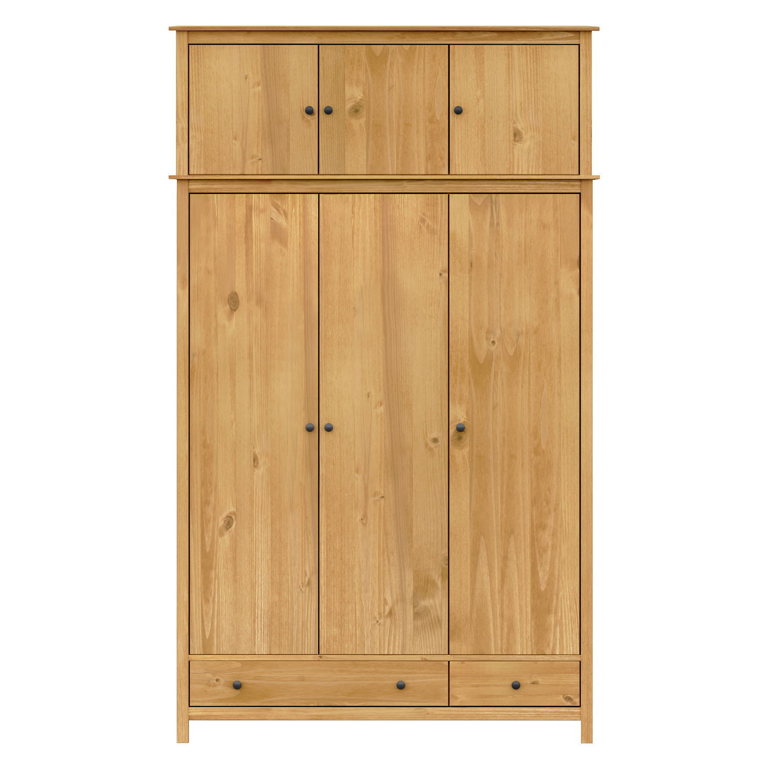 Kód produktu: 8068VMateriál je masiv borovice voskovaná v medovém odstínu. Kovové úchytky jsou v barevném provedení černěná mosaz. Prostor skříně je dělený v poměru 2:1:2. V levé a pravé širší části se nachází šatní tyč a police na klobouky. Ve střední užší části jsou umístěny tři police. Ve spodní části jsou tři zásuvky s kovovými pojezdy. Doporučený nástavec je 8169V.