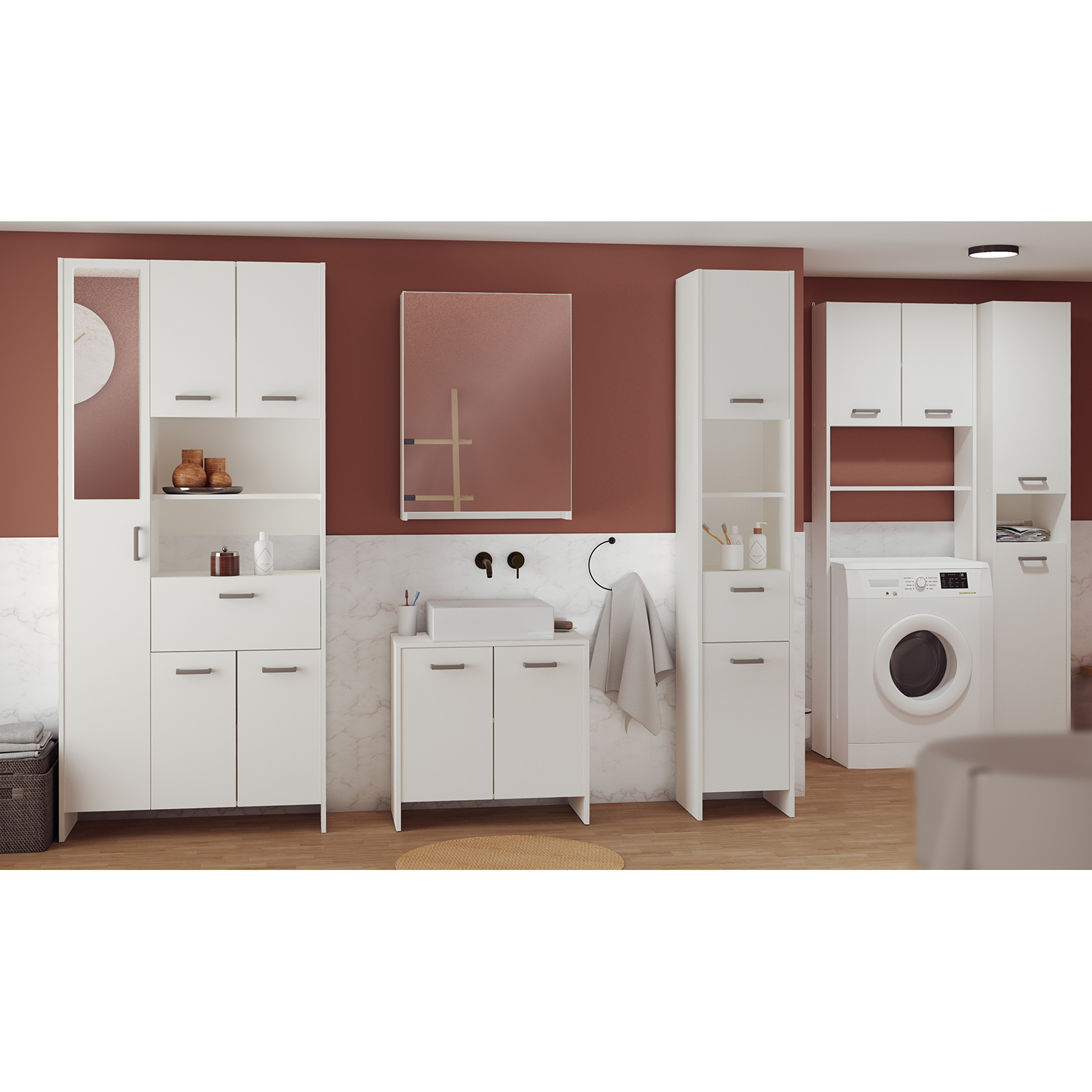 Barevné provedení matná bílá. Obsahuje jednu zásuvku s kovovými pojezdy. V pravé části se nacházejí dvě skříňky, z nichž každá má jednu polici. V levé části je vysoká skříňka se zrcadlem a čtyřmi policemi. Maximální nosnosti uvedeny v návodu k montáži. Tento nábytek je součástí sestavy KORAL.